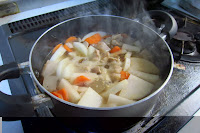 下茹でしたこんにゃくと大根、ニンジン、モツを煮込む